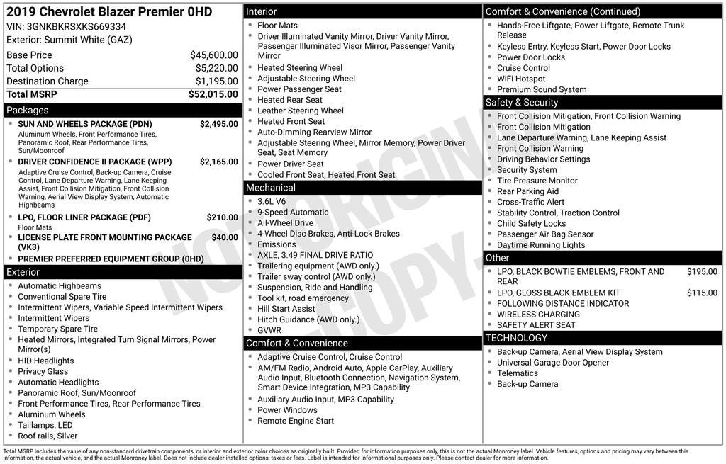 Recent Arrival!AWD.Summit White 2019 Chevrolet Blazer Premier AWD 3.6L V6 SIDI DOHC VVT 9-Speed AutomaticPlease reach out to us at: 585-637-3999 to see how we will provide a SPURR-tacular purchase and ownership experience!Awards:* JD Power Automotive Performance, Execution and Layout (APEAL) Study