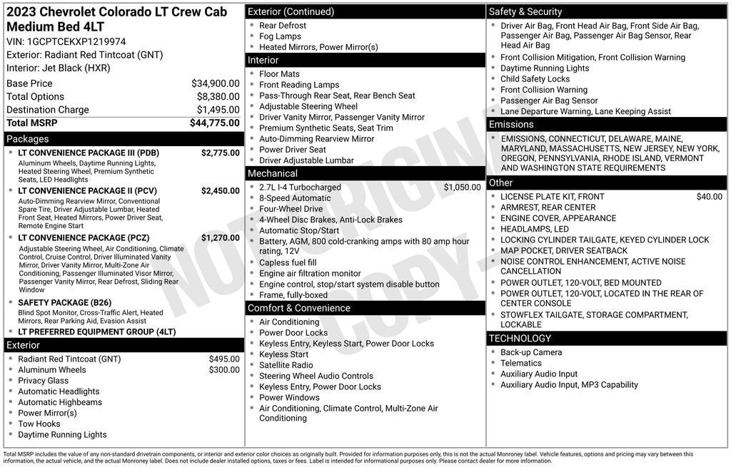 Priced below KBB Fair Purchase Price! Odometer is 8989 miles below market average!4WD, 120-Volt Bed Mounted Power Outlet, 120-Volt Power Outlet, 6-Speaker Audio System Feature, 8-Way Power Driver Seat Adjuster, AM/FM radio: SiriusXM, Appearance Engine Cover, Apple CarPlay/Android Auto, Auto High-beam Headlights, Automatic Emergency Braking, Blind Zone Steering Assist, Brake assist, Chevy Safety Assist, Delay-off headlights, Driver & Front Passenger Illuminated Visors, Driver Seatback Map Pocket, Dual Rear USB Ports (Charge Only), Dual-Zone Automatic Air Conditioning, Electronic Automatic Cruise Control, Evotex Seat Trim, EZ-Lift & Lower Tailgate, Following Distance Indicator, Forward Collision Alert, Front Bucket Seats, Front LED Fog Lamps, Front Pedestrian & Bicyclist Braking, Heated Driver & Front Passenger Seats, Heated Power-Adjustable Outside Mirrors, Heated Steering Wheel, Inside Rear-View Auto-Dimming Mirror, IntelliBeam Automatic High Beam On/Off, Lane Keep Assist w/Lane Departure Warning, LED Daytime Running Lamps, LED Headlamps, LEDs Stop Tail Lamp, LT Convenience Package, LT Convenience Package II, LT Convenience Package III, Manual Rear-Sliding Window, Navigation System, Noise Control Enhancement (DISC), Power Driver Lumbar Control Seat Adjuster, Preferred Equipment Group 4LT, Rear Center Armrest, Rear Cross Traffic Braking, Rear Park Assist, Rear step bumper, Rear-Window Electric Defogger, Remote keyless entry, Remote Vehicle Starter System, Safety Package, SiriusXM Radio, StowFlex Tailgate Storage Compartment, Tailgate Keyed Cylinder Lock, Tilt & Telescoping Steering Column, Wheels: 18 x 8.5 Android Dark Full Gloss Aluminum, Wireless Charging.Radiant Red Tintcoat 2023 Chevrolet Colorado LT 4WD 2.7L Turbo 8-Speed AutomaticPlease reach out to us at: 585-637-3999 to see how we will provide a SPURR-tacular purchase and ownership experience!